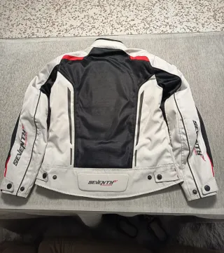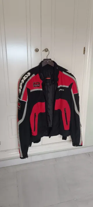 Chaqueta de moto con diseño deportivo y detalles en rojo y gris. - Cierre frontal con cremallera. - Cinturón ajustable en la cintura. - Puños con cremallera y velcro. - Bolsillos frontales con solapa y hebilla - Forro desmontable. - Talla L - Ajustes en brazo, antebrazo y cintura - Protectores interiores