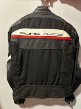 Chaqueta de moto IXS Pure Race en color negro, confeccionada en cuero. - Diseño deportivo. - Detalles en blanco y rojo. - Cierre frontal. - Mangas con protecciones. - Talla 56