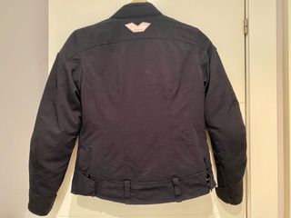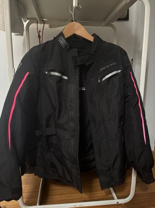 Chaqueta de moto REV'IT! en color negro con detalles en rosa. Incluye relleno . - Talla XS. - Cierre frontal con cremallera y botones. - Bolsillos frontales. - Cinturón ajustable en la cintura. - Bandas reflectantes en mangas y pecho.