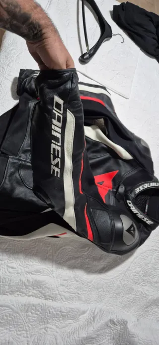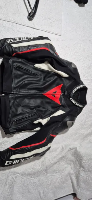 Conjunto de chaqueta y pantalón de moto de cuero. - Chaqueta con detalles en gris y rojo. - Pantalón negro con protecciones en rodillas. - Diseño deportivo. - Protección en la chaqueta. - Doble forro. - Chaqueta poco uso y pantalón sin estrenar. - Negociables.