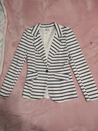 Chaqueta de tela ligera con un clásico estampado de rayas marineras. Forrada. Talla pequeña, equivale a una XS.