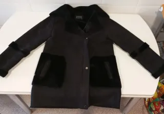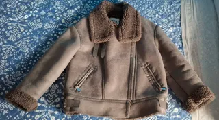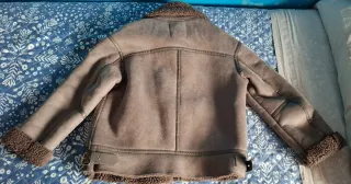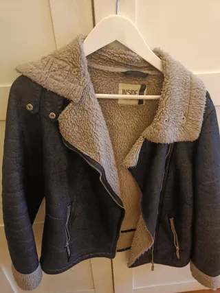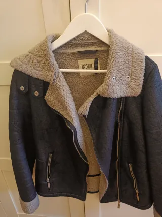 Chaqueta de estilo aviador con forro interior de borreguito. - Cuello con solapas y detalle de hebillas. - Cierre de cremallera frontal. - Bolsillos laterales con cremallera. - Puños y bajo con acabado de pelo. - Esta nueva sin etiquetas.