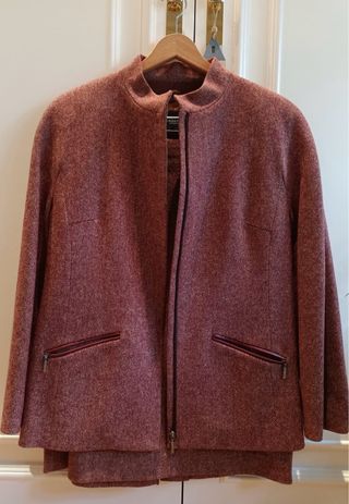 Conjunto de chaqueta y falda de Burberry. - Chaqueta de tweed con cremallera. - Bolsillos delanteros con cremallera. - Cuello mao. - Falda a juego. Medidas/ chaqueta hombros 54- sisa 49- manga 55- largo 67 Falda/ cintura 42-largo 65-cadera 54