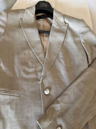 Chaqueta de vestir de Zara, ideal para un look elegante. - Color beige con detalles grises. - Diseño clásico con solapa. - Cierre de un botón. - Bolsillo de ojal en el pecho. - Puños con botones.