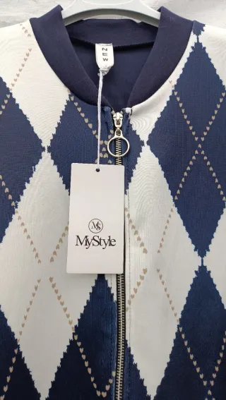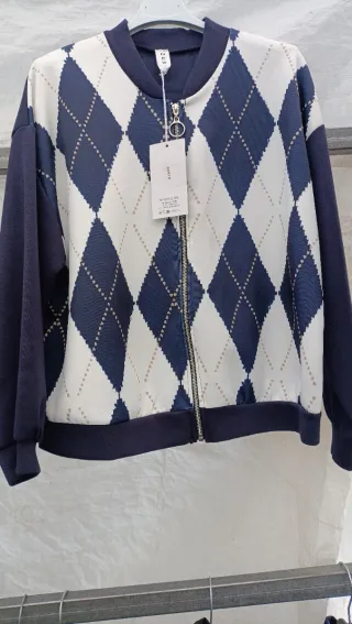 Chaqueta estilo bomber con estampado argyle. - Diseño de rombos en azul y blanco. - Mangas y cuello en contraste azul marino. - Cierre de cremallera frontal.