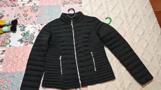 Chaqueta acolchada de mujer. Color negro intenso, con cremalleras plateadas, sin capucha. Está nueva.