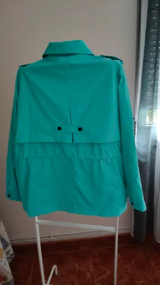 Chaqueta de mujer con un llamativo color turquesa. Presenta un diseño moderno y funcional. - Cierre de botones. - Dos bolsillos con cremallera. - Cordón ajustable en la cintura. - Detalles de hombreras con botón.