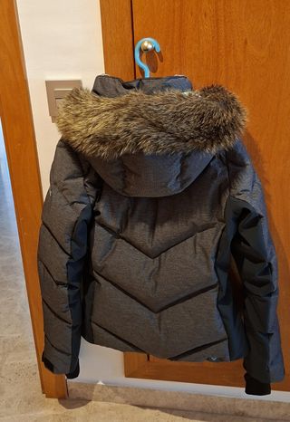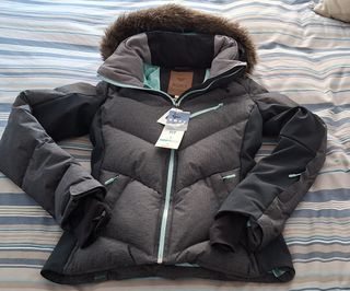 Chaqueta técnica ski/snow Roxy, talla S, gris/turquesa. SIN ESTRENAR - Tecnología impermeable 15K ROXY DryFlight - Tejido con paneles laterales elásticos para movilidad - Capucha ajustable y desmotable, con pelo sintético - Aislamiento térmico: Plumón 600 fill power - Cuello alto con tejido interior suave - Paño de limpieza de mascarillas/gafas en bolsillo izquierdo - Clip para llaves - Faldones de nieve - Sistema de fijación al pantalón - Bolsillos cremallera: --- 2 laterales --- 1 pecho --- 1 manga (forfait) --- interior --- rejilla para gafas - Mangas interiores licra, con orificio para el pulgar - PRECIO ORIGINAL = 369,90€.