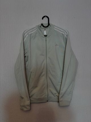 Chaqueta deportiva de Adidas en un tono verde claro. Presenta el diseño clásico de tres rayas en las mangas. - Cierre de cremallera frontal. - Cuello redondo. - Puños y cintura elásticos.