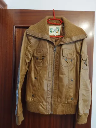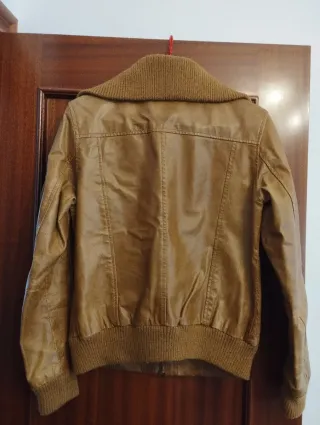 Chaqueta de estilo moderno de polipiel en color marrón con cuello de punto. - Cierre de cremallera frontal. - Dos bolsillos con solapa en el pecho. - Puños y bajo elásticos. - Bolsillos laterales. - Forro interior ( el forro tiene alguna pequeña manchita. Ver última foto). - Está usada pero bien conservada.