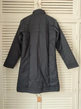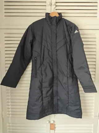 Chaqueta larga original de mujer de la marca Adidas talla M en color gris oscuro. Las cremalleras funcionan perfectamente con un tirador de uno de los bolsillos roto, medidas y detalles en fotos. - Diseño acolchado. - Cuello alto sin gorro. - Cremallera frontal. - Bolsillos laterales con cremallera. - Logo de Adidas en la manga a la altura del hombro.