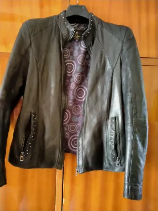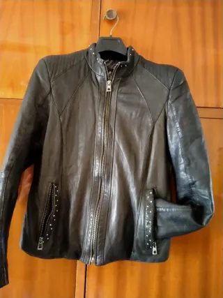 Chaqueta de piel para mujer con un diseño moderno y detalles únicos,muy poco uso -talla L vale también para M - Cuello alto con tachuelas. - Cierre frontal de cremallera. - Bolsillos delanteros con cremallera y tachuelas. - Costuras decorativas en hombros y puños.