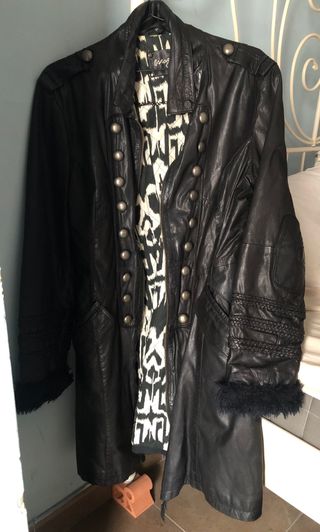 Chaqueta de cuero estilo militar con forro estampado. - Diseño con doble botonadura. - Detalles trenzados en las mangas. - Puños con pelo sintético. IMPORTANTE - Tenga en cuenta que no voy a enviar este artículo. Solo se puede recoger en Mallorca.