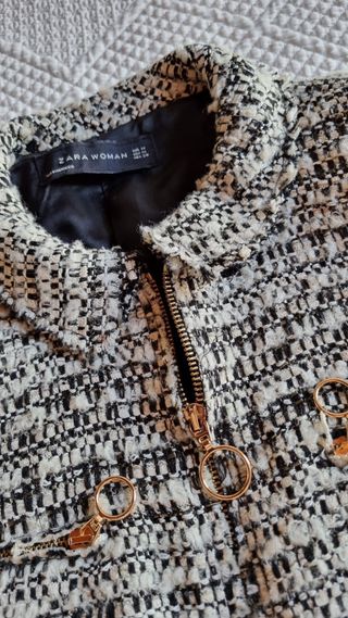 Chaqueta de Zara en tejido tweed negro y blanco. Talla M. Estrecha. Buen estado.