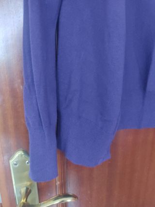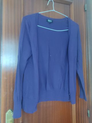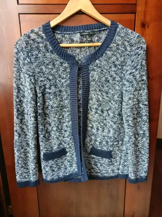 Chaqueta de punto finito de color azul marino con rayas blancas. Manga tipo poncho. Tejido muy suave y con caída. Marca Mango. Talla única. En buen estado.