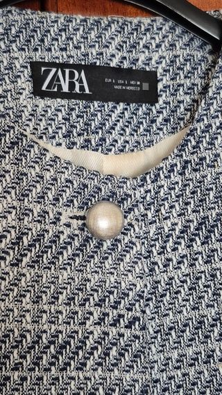 Elegante chaqueta de Zara con un diseño texturizado en tonos azules y blancos. Presenta un cierre de botón metálico. - Tejido con textura. - Cierre de botón.