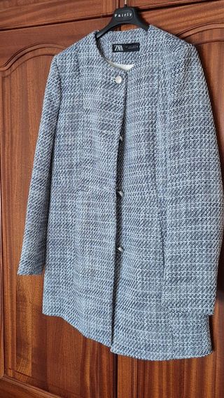 Elegante chaqueta de cuadros de la marca Zara. Un clásico que nunca pasa de moda. - Diseño de cuadros blancos y negros. - Corte entallado. - Cierre de un botón.
