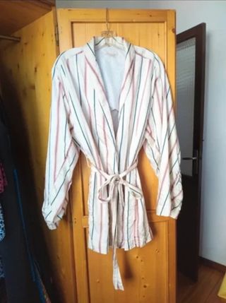 Precioso kimono con forro, muy cómodo. Perfecto para tallas de la M a la XL. Tiene bolsillos. A estrenar. - Diseño de rayas en colores variados. - Corte holgado y cómodo.