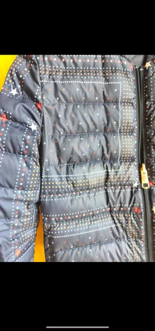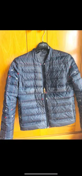 Chaqueta de plumón reversible azul marino con estampado de estrellas rojas, blancas y beige. Dos bolsillos con cremallera y dos interiores de plastón. Talla M, medidas 40 cm de hombros, 50 de sisa y 57 de largo. Ligero y cálido. Impecable, como nuevo.