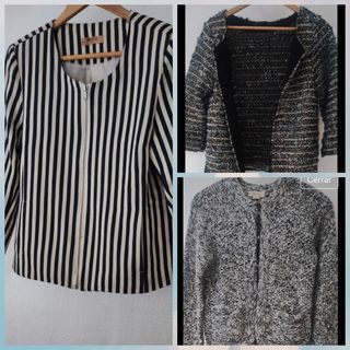 Tres blazers elegantes para mujer. Dos son de tweed en blanco y negro, con diseños diferentes. Uno tiene rayas verticales en blanco y negro. Están en buen estado. - Tres chaquetas incluidas. - Diseño elegante y versátil. - Perfecto para cualquier ocasión.Tallas M,L y XL, valen para misma talla, de puede ver medias en fotos individual en mi perfil