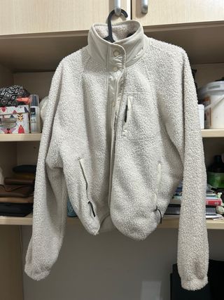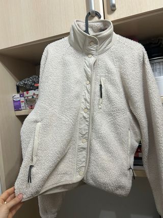 Chaqueta de borreguito con detalles en negro. - Diseño moderno y cómodo. - Cierre de cremallera. - Bolsillos con cremallera. - Puños y bajo con detalle de cinta negra.