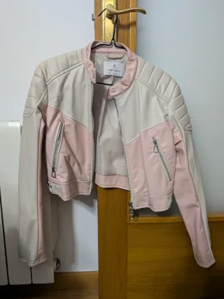 Cazadora estilo biker con un diseño moderno y juvenil. - Combinación de colores blanco y rosa. - Cuello redondo con cierre de botón. - Cremalleras decorativas en los bolsillos.