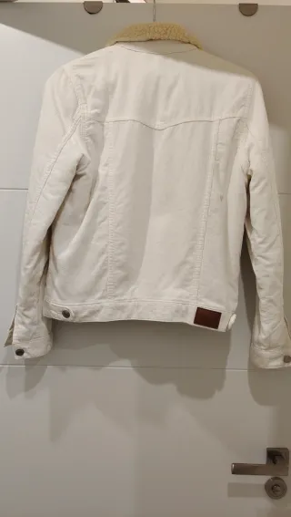 cazadora corta fabricada en viscosa y poliéster, con imitación a piel, talla M, en color blanco, con tres bolsillos con cremalleras en el frente, se abrocha con cremallera, grandes solapas, forro sintético de color claro,necesita llevar a la modista para arreglar y reparar roces en el cuello, también en el armario, una prenda azul junto a ella se decoloro y ha dejado en la cazadora tonos azulados que no se cómo eliminar, o si sería mejor imprimir en toda la cazadora tonos y manchas azuladas, o pintarla entera en color oscuro, estos son los motivos por los que se vende tan barata.
