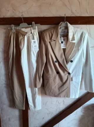 Traje de dos piezas a rayas. Color marrón claro y blanco. Talla S. A estrenar. -