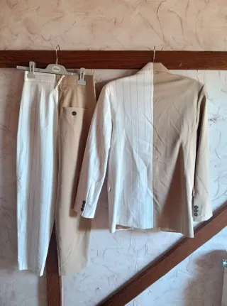 Precioso traje de mujer en color blanco. Ideal para ocasiones especiales. -Traje de dos piezas: chaqueta y pantalón. -Diseño de rayas verticales. -Tiene un corte impecable y favorecedor. -La chaqueta tiene un broche decorativo precioso