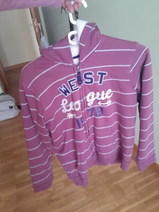 Chaqueta de invierno con capucha y un diseño de rayas blancas sobre fondo rosa. Talla 13/14 - Cierre de cremallera. - Forro interior blanco. - Estampado WEST LEAGUE 1978 en la parte delantera.