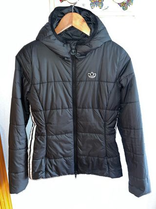 Chaqueta acolchada con capucha y detalles deportivos. - Logo de Adidas en blanco en el pecho. - Tres rayas blancas en las mangas. - Cierre de cremallera frontal. - Bolsillos laterales con cremallera.