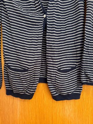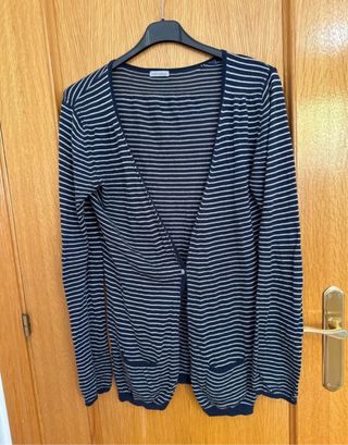 Chaqueta de punto ligera de la marca Individual, en color azul marino con rayas blancas. Tejido 100% algodón, muy cómoda y perfecta para entretiempo. Tiene dos bolsillos delanteros y cierre con botones. Está en muy buen estado, sin bolitas grandes ni desgastes.