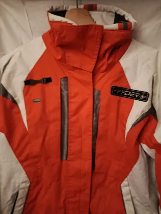 Chaqueta tipo beisbolera, de manga larga. Es roja y blanca, con detalles en las mangas y los puños. Tiene un diseño bordado en la parte delantera. Está en buen estado.