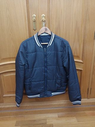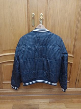 Cazadora de mujer reversible y acolchada.Anverso de color azul marino con lunares pequeños blancos y por el reverso de color azul marino y mangas en color blanco. Puños y cuello de color azul marino y blanco. Bolsillos laterales en anverso y reverso. Nueva,sin estrenar.