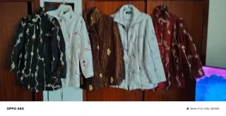 Conjunto de cinco chaquetas acolchadas con un diseño estampado. - Chaqueta negra con estampado blanco y marrón. - Chaqueta blanca con estampado marrón. - Chaqueta marrón con estampado floral. - Chaqueta gris claro con estampado blanco. - Chaqueta burdeos con estampado blanco.