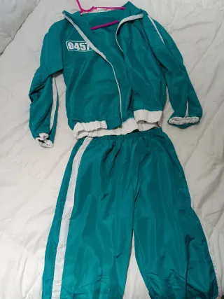 Disfraz inspirado en la popular serie El Juego del Calamar. - Conjunto de chaqueta y pantalón. - Diseño con detalles blancos. - Número 0457 visible en la chaqueta.