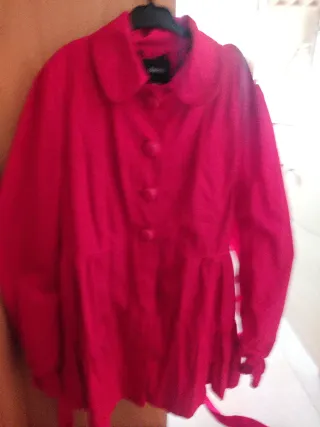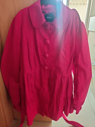 Chaqueta de mujer en color rojo, con un diseño moderno y favorecedor. Perfecto estado. Marca blanco. Talla 38 - Cierre de botones. - Cuello redondo. - Cinturón para ajustar. - Detalle de volantes en el bajo.