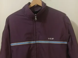 Chaqueta deportiva de color burdeos con forro interior de polar. - Diseño con franjas azules y blancas en el pecho. - Cremallera frontal. - Bolsillos laterales.