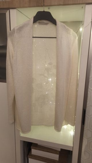 Chaqueta de punto de la marca Cortefiel, con un diseño jaspeado en tonos grises y blancos. Muy bonita y muy cómoda. Sin cremallera. - Tejido texturizado. - Cuello abierto. - Manga larga. - Bolsillos delanteros. Con hilo plateado.