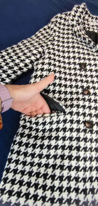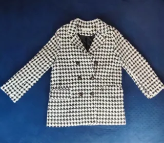 Chaqueta de mujer con estampado clásico de pata de gallo en blanco y negro. Diseño tipo blazer cruzado con doble botonadura frontal y solapas. Tiene bolsillos delanteros y está completamente forrada con guata por dentro, lo que la hace abrigada y con buena estructura. La tela es gruesa y consistente. Largo aproximado de 68 cm. Corresponde a una talla M amplia. Sin estrenar