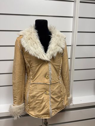 Chaqueta de Stradivarius estilo vintage en color camel. Talla S. Destaca por su cuello y puños de pelo blanco muy suave y detalles de pelo en las costuras. Acabado en antelina de tacto muy agradable.
