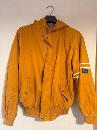 Chaqueta amarilla deportiva con capucha. Poco uso - Cierre de cremallera y botones a presión. - Bolsillos laterales con solapa y botón. - Puños y cintura elásticos. - Detalle de bandas blancas en manga izquierda. - Parche con texto en manga izquierda.