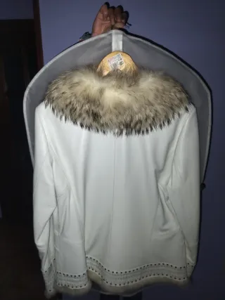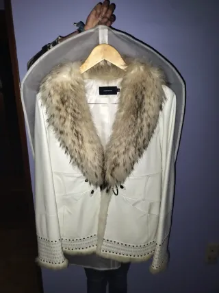 Elegante chaqueta de piel en color blanco, con un distintivo cuello de pelo. - Diseño con detalles de tachuelas en puños y bajo. - Cierre frontal con enganches. - Forro interior. Posibilidad de descuento al hacer más de una compra, más artículos en mi perfil. Trato en mano en Oviedo.