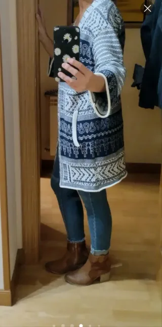 Elegante chaqueta de punto de Adolfo Domínguez en color blanco y azul marino con un bonito estampado geométrico tipo jacquard. Corte largo con bolsillos laterales. Suave y abrigada. Perfecta para entretiempo o para combinar con looks casual o elegantes. Aunque pone talla S equivale a una talla L. Perfecto estado