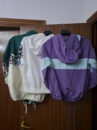 Conjunto de tres chaquetas deportivas con diseños variados. - Chaqueta verde con detalle animal print y beige. - Chaqueta blanca con detalles en azul y animal print. - Chaqueta morada con bloques de color y texto. - Cierre de cremallera frontal en todas las chaquetas. - Cordones ajustables en la parte inferior.