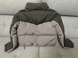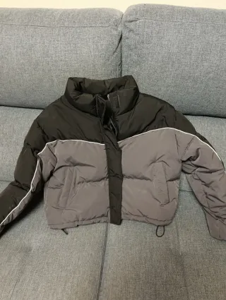 Chaqueta acolchada de corte moderno overside, con un diseño bicolor que combina negro y gris. Ideal para un estilo casual. Talla S/M. •Diseño acolchado. •Cuello alto. •Cierre de cremallera. •Detalle de ribete blanco en mangas y costados. •Cordones ajustables en el bajo. Medidas; Pecho: 55cm Largo: 51cm Mangas: 52cm