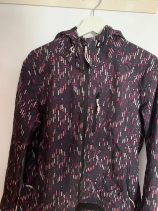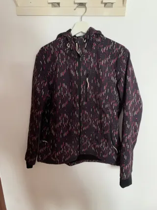 Chaqueta deportiva de color negro con bandas gris muy claro.Bolsillos delanteros ocultos que se cierran con cremallera (foto 3). Bolsillo oculto en la espalda con cremallera (foto 5) y capucha que se introduce en el cuello.Bolsillo interior y forro de malla. Talla S, que corresponde con una 36-38. Cierre de cremallera. Diseño moderno y funcional.