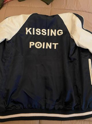 Chaqueta estilo bomber con un diseño moderno y llamativo. - Mangas de color blanco. - Cuerpo principal en azul marino. - Acabado satinado. - Puños y cuello con detalles de rayas.