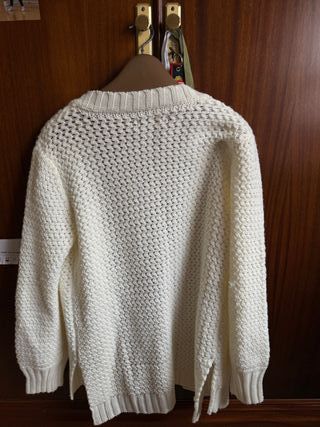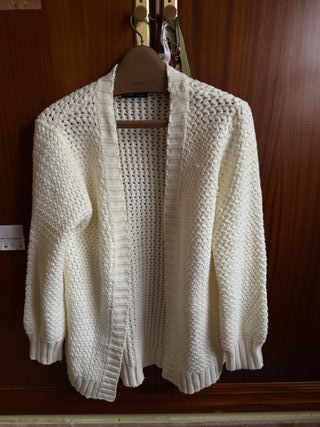Chaqueta de punto de Zara en color blanco. Es una prenda cómoda y versátil. - Diseño abierto. - Tejido grueso y cálido. - Manga larga.
