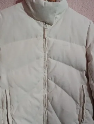 Chaqueta de abrigo acolchada. Dice talla M pero es grande da talla L. Cierra pero el inicio de la cremallera cremallera está como se ve en la última foto, por eso el precio. - Diseño acolchado. - Bolsillos delanteros con ribete. - Cuello camisero.